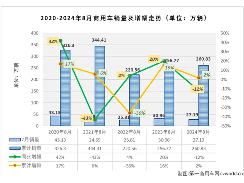 1-8月累計銷量小增2%,解放等累計增幅達兩位數 2024年1-8月,商用車市場累計銷售260.83萬輛,同比累計增長2%,約比去年1-8月累計多銷售4.06萬輛,這個數字在7月過后還達到7.84萬輛,累計增幅較7月過后(+3%)縮窄1個百分點。